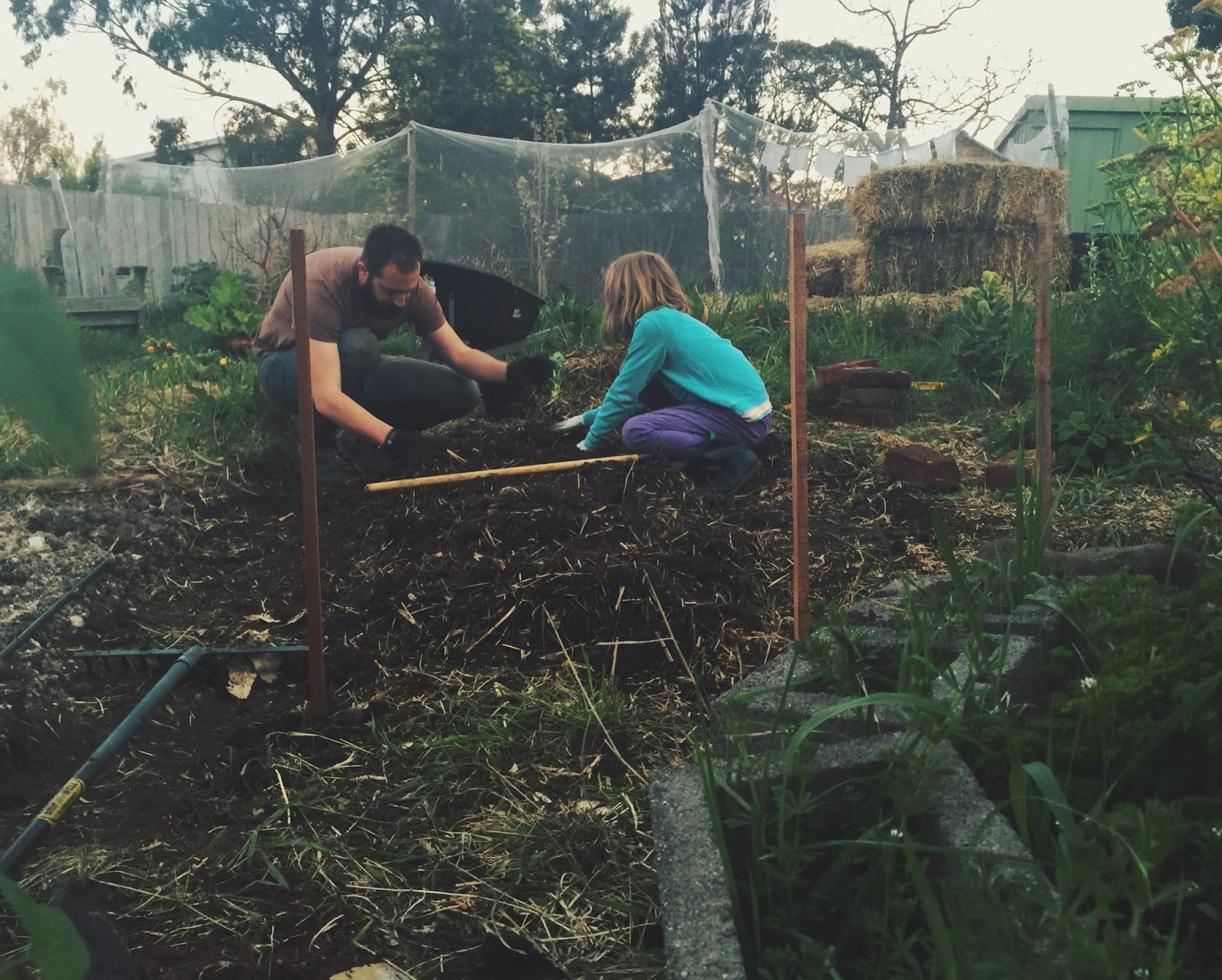 It's the first time we've really dug a garden bed, always opting for raised beds in the past. But we're hoping to give ourselves just a little extra topsoil in our mega-heavy-clay-soil garden. We're observing and chatting about the history of certain patches of soil, what grew where and how and why the soil is the way it is. It's surprising the difference chooks can make to a small patch of heavy clay soil in just one month and how, even months later, you can tell that they've been there by the way the solid crumbles in your hands. We're thrilled that every little bit of effort we've put in so far has paid off. There are some seriously lush areas of topsoil there! We're so glad that our years as custodians of this particular patch of soil haven't been wasted, as slow as the progress seems to have been. It's also surprising how when you've lived somewhere for many years, you can still find remnants of those who've lived there before - old pipes, rusty pliers, broken teacups hidden beneath the soil. We're taking note and learning more as we go.