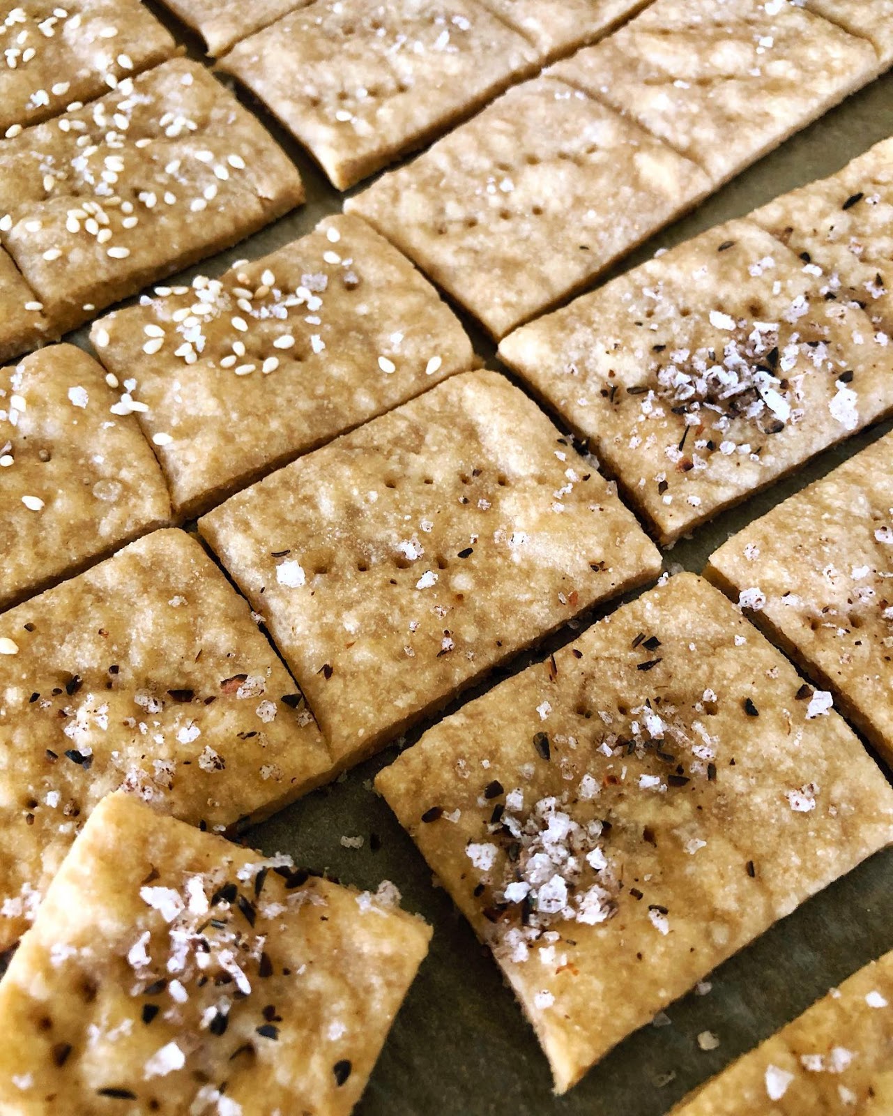 Mix all the ingredients together into a ball of dough. Dust your table surface with a little flour and knead the dough until it’s fairly smooth. Roll the dough flat until it’s only a few millimetres thick (thinner = crunchier). I do this on the back of a baking tray, lined with parchment or greased and dusted. Cut the dough into squares with a knife or pizza cutter, then prick each square with a fork. Drizzle with olive oil and spread the oil gently with a pastry brush. Sprinkle whatever flavours you’d like on top - things like sea salt, sesame seeds, seaweed salt, herbs like rosemary are all great. Bake at 180 degrees for 25 minutes. Let cool and eat with your favourite cheese or dip, or just as they are!